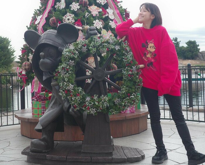 この日は、ミニーマウスが描かれたピンクのトレーナーに黒のズボンを合わせたコーデを披露しています。リースが飾られた舵を切るミッキーマウスとともに、鷲見さんはニッコリ笑顔を浮かべていて、なんとも楽しそうな様子。