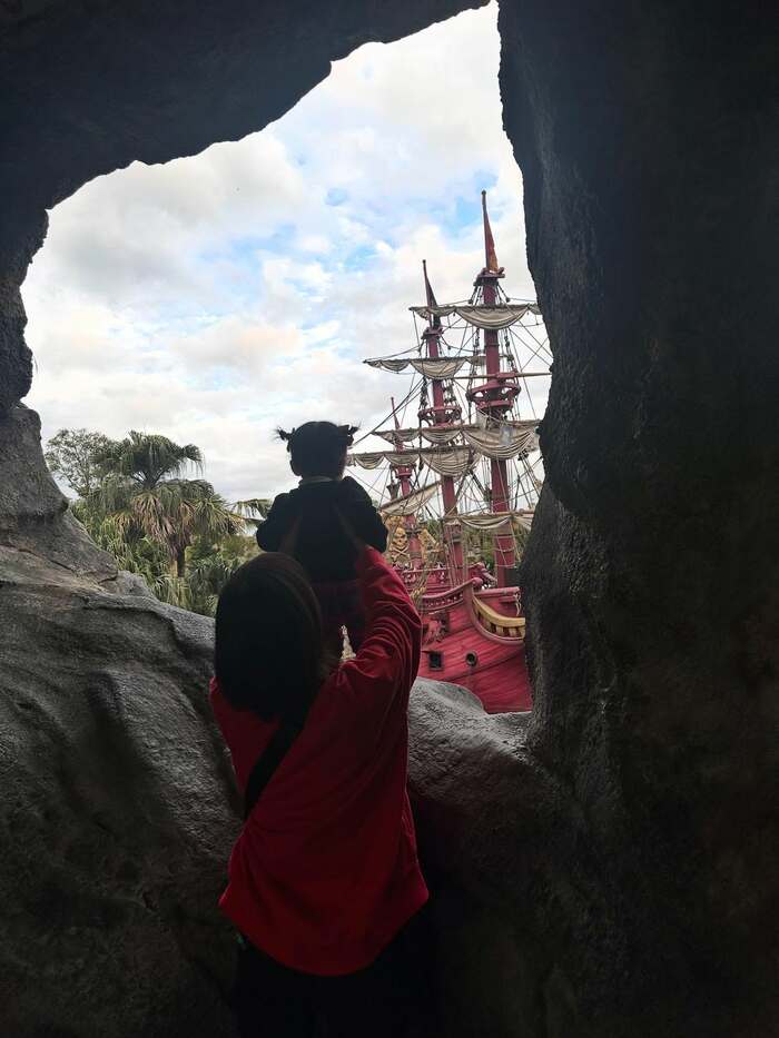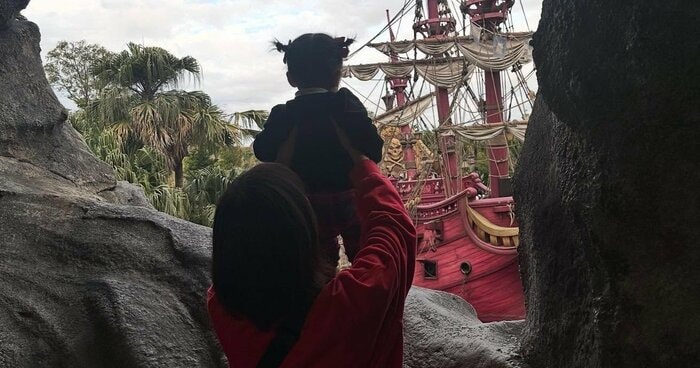 ドクロ岩から大きな海賊船を眺めているのでしょうか、鷲見さんは長女を両手で抱き上げています。