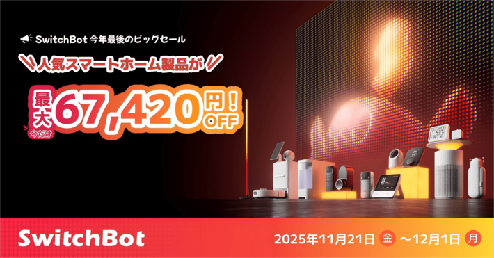 IoT・スマートホーム事業を展開する「IoTデバイスNo.1ブランド(※2022年11月 家電Biz調べ)」のSWITCHBOT株式会社(本社:東京都渋谷区)は、2025年11月21日(金)~12月1日(月)の期間中、Amazon公式ストアおよびSwitchBot公式サイトにてブラックフライデーを開催いたします。期間中は、人気のロボット掃除機「S10」が6万7420円割引になるほか、話題の新製品「AIアートキャンバス」や、新色が登場した空気清浄機、さらにハブ製品、スマートロックなど、幅広いラインナップが特別価格で登場。年に一度のこのチャンスをどうぞお見逃しなく。