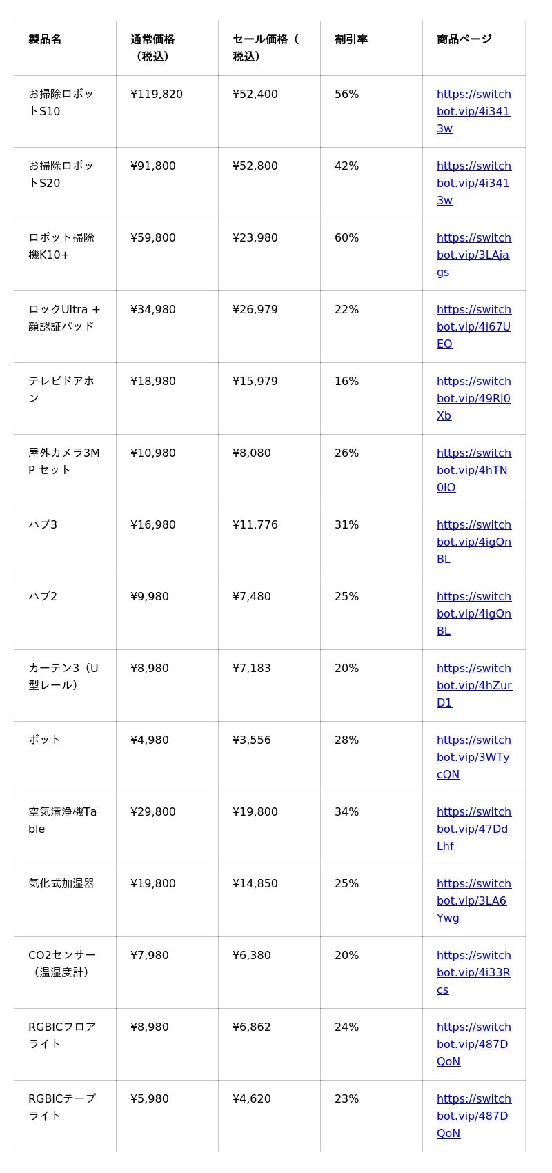 ※本価格表はAmazon公式店の情報を基にしており、SwitchBot公式サイトとは一部異なる場合があります。