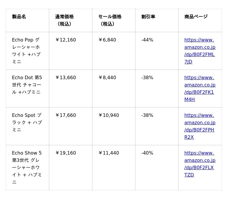 【Amazon Echo + ハブミニセット セール価格(一部抜粋)】
