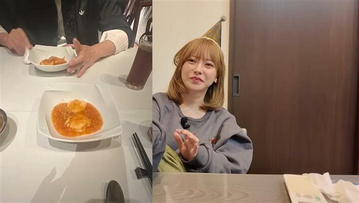 誕生日には都内の高級中華料理店へ訪れたそうで、おいしそうなエビチリが盛り付けられたショットを披露します。写真には、向かい側に座っている旦那さんの手元が写っています。