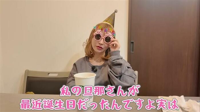 動画を見ると、パーティーハットをかぶり、バースデーデザインのサングラスをかけた まりなさんの姿が!「私の旦那さんが最近誕生日だったんですよ実は」とコメントしています。