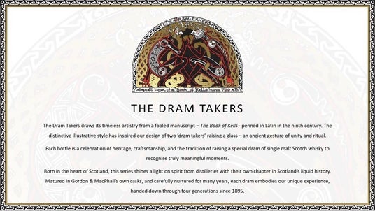 ザ・ドラム・テイカーズとは9世紀の装飾写本『ケルズの書』に着想を得た、ゴードン&マクファイルの歴史的ラベル・シリーズです。グラスを掲げる2人の「ドラム・テイカー(=一杯を分かち合う者)」は、古来の「結束と儀式」を象徴するモチーフとして描かれています。