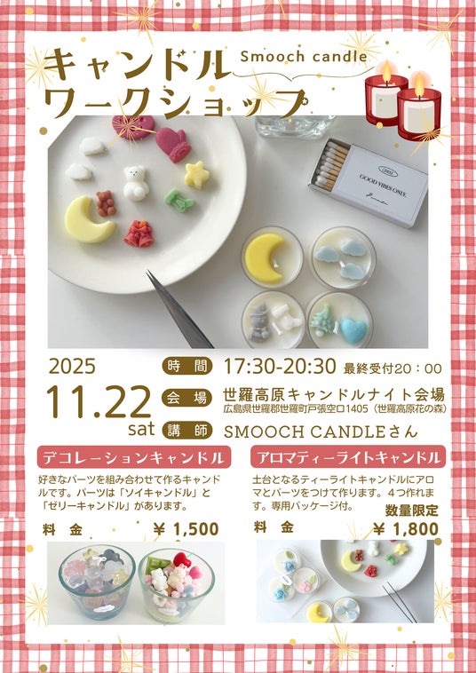 キャンドルワークショップ広島を中心に活動中のキャンドル作家Smooch candleさんをお迎えしてキャンドルづくりワークショップを開催します。パーツを組み合わせて作るキャンドルで、お子さまもお楽しみいただける内容です。