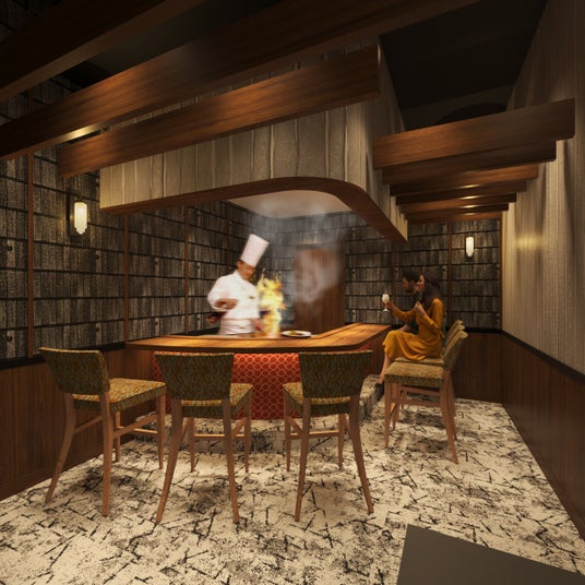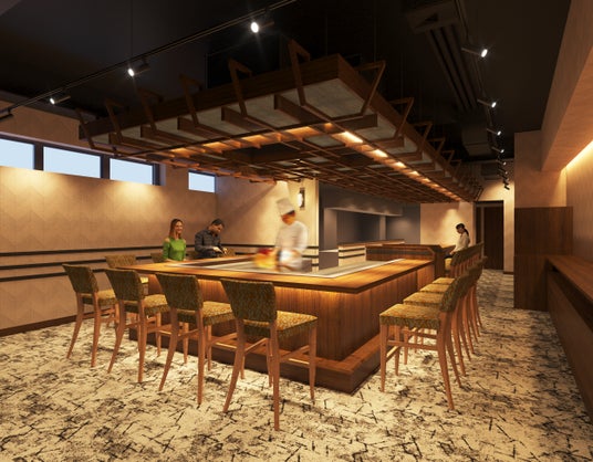 6店舗目となる新宿店は、新宿駅中央東口より徒歩1分という抜群のアクセスを誇る店舗としてオープンします。店内は、東京の都心部でありながら、整然と区画整理された“碁盤の目”の街並みと超高層ビル群をモチーフに、カウンター・個室・天井の意匠を日本建築の様式「格天井(ごうてんじょう)」になぞらえて設計しました。格式ある建築美にモダンな要素を融合させることで、国内外すべてのお客様の目を引く洗練された空間を実現しています。