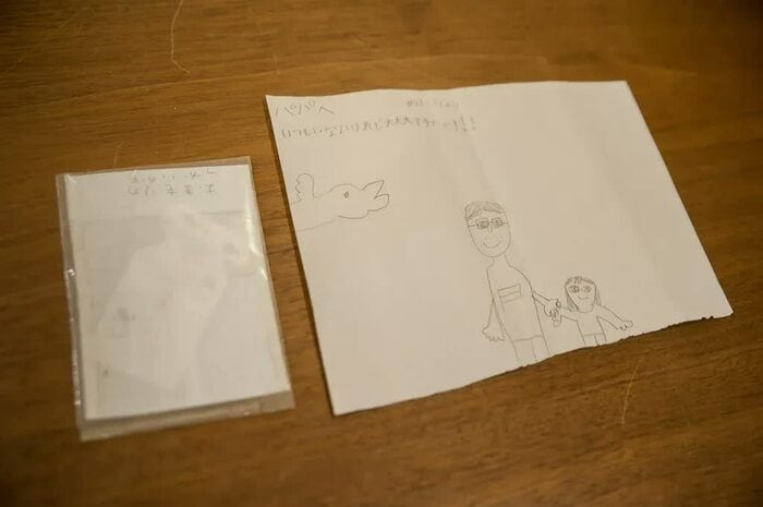 子どもは娘1人、息子1人です。この絵は娘が小学校に上がったくらいの頃ですかね、父の日か何かのプレゼントについてた手紙だと思います。娘からもらった絵や手紙は全部とってありますよ。人を笑わせるのが好きで、人が困った顔をしたり泣いたりしてるのが自分のことのように辛く感じる優しい子なんです。こないだも集団登校の時、誰かの家の壁に落書きがしてあったのを見て「私が消す!」って言って消し始めたそうです。上手く言えないんですけど、僕なんかと比べて、人としてすごいと思います(笑)。