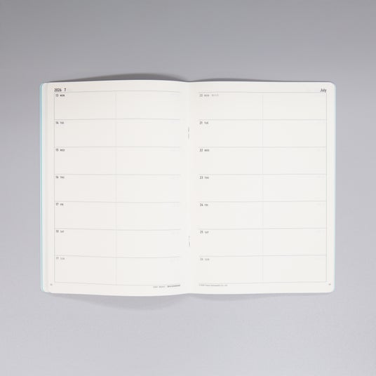 週間ダイアリーは次の週まで管理しやすいの見開き2週間タイプ。午前と午後の予定を分けて書ける中央の仕切り線もあります。