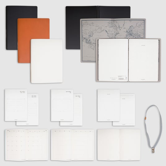 A5サイズの中綴じダイアリーとノートを2冊同時に収納できる構造がfixieシリーズの特徴です。月間・週間・日付フリータイプなど、用途に応じた組み合わせが可能で、仕事・学習・趣味など幅広いシーンで活躍します。ノートは簡単に差し替えられ、専用のゴムバンドクリップを使えば表紙を留めると同時にデザインアクセントとしても機能します。fixieシリーズはデザイン性と機能性を兼ね備えた、長く使えるサステナブルな製品です。