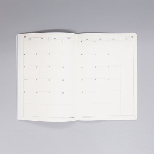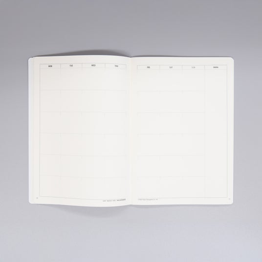 月間ダイアリーは月を全体で確認しやすい見開き1ヶ月間ブロックタイプ。ちょっとしたメモも空白に書きやすいレイアウトにしました。中紙は目に優しい薄いクリーム色を採用。