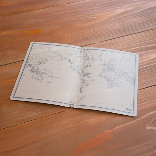 カバー素材には、ドイツ「サラマンダー社」製の高品質ボンデッドレザーファイバ(皮革繊維再生複合材)を採用。柔らかくしなやかな手触りと、カバー単体で約77gという軽さを両立しました。内側にはfixie専用に書き起こしたオリジナルの世界地図デザインを高精細シルク印刷で表現。地図づくりのノウハウを活かした繊細な表現により「地図」の持つデザイン性も楽しめます。