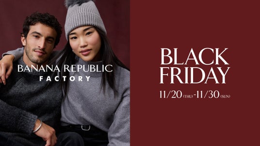 バナナ・リパブリックは、11月20日(木)から11月30日(日)まで、全国のファクトリーストア(アウトレットストア)で対象商品が50%OFFとなるブラックフライデーイベントを開催します。さらにブラックフライデー期間中、メリノウールセーター、コージーセーター、コーディロイパンツなど、ホリデーシーズンに映えるアイテムをスペシャルプライスで販売します。