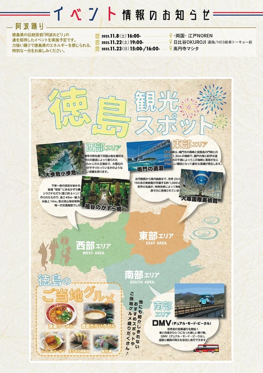 【徳島県メニューフェア】11月7日から11月30日まで 【阿波おどりイベント】-両国-江戸NOREN:11月8日(土) 日比谷OKUROJI:11月22日(土) 高円寺マシタ:11月23日(日)