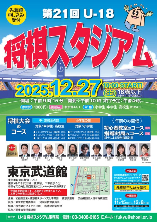 「スポーツで創る、東京の未来」をスローガンに、「スポーツフィールド・東京」の牽引役として様々な事業を展開する公益財団法人 東京都スポーツ文化事業団(渋谷区・千駄ヶ谷)は、12月27日(土)、東京武道館にて「第21回 U-18 将棋スタジアム」を開催します。