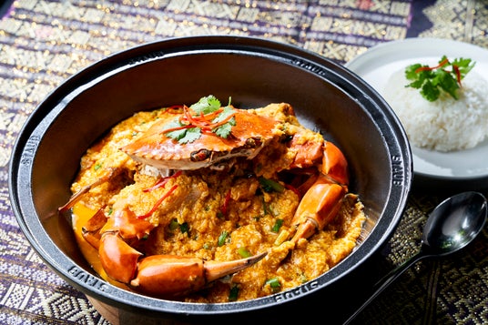 蟹のカレー炒め(プー・パッ・ポン・カリー):蟹を丸ごと使い、特製カレーペーストと卵で炒め煮にした人気メニュー。濃厚な蟹の風味が辛さをまろやかに包み込み、後を引く美味しさです。