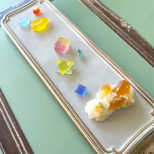 11月の誕生石を手切りの琥珀糖で表現。表面はシャリっと、中はぷるんとした食感がおもしろい。