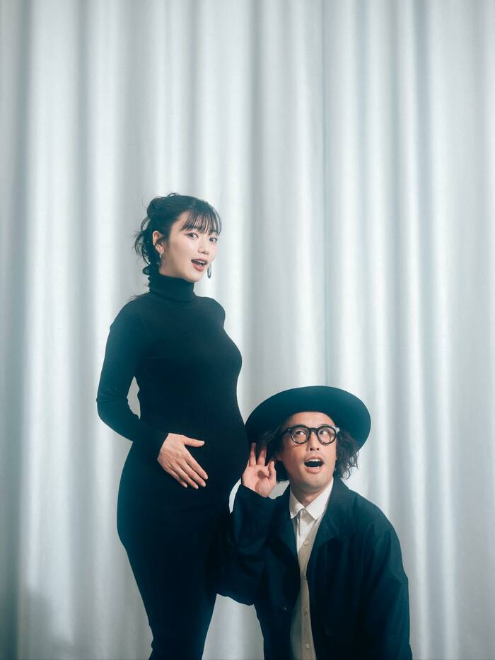 やついさんの投稿では、黒のタイトなワンピースに身を包んだ松嶋さんの姿が!ふっくらおなかの近くで、黒のハットをかぶった やついさんが聞き耳を立てるようなポーズを見せています。我が子に会えるのを楽しみにしていることがうかがえますね。