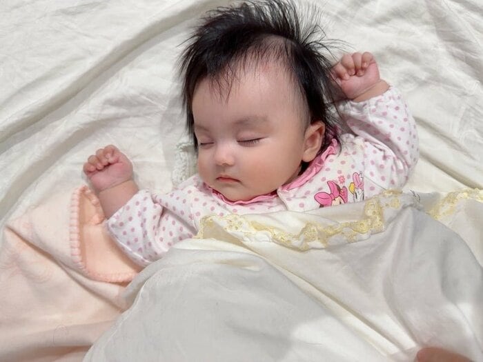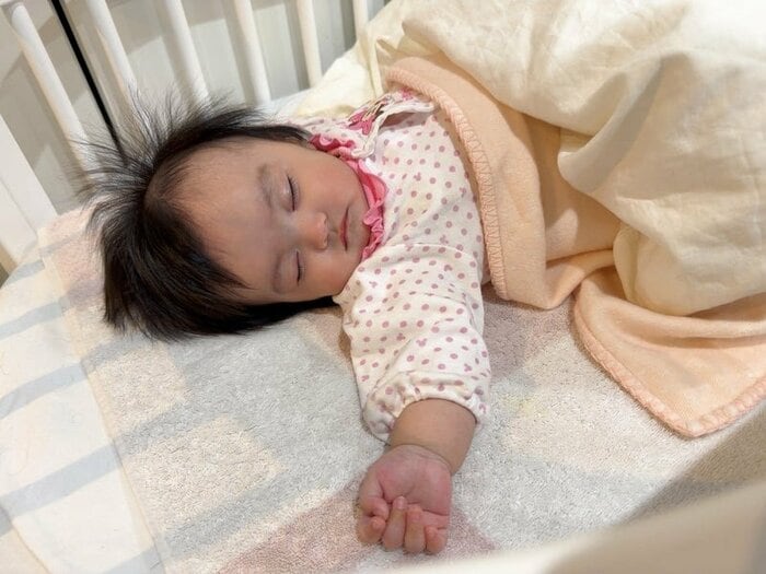 “ググガガちゃん”は、両手をギュッと握って熟睡している様子。長いまつ毛が際立つチャーミングフェイスに癒やされますね。「一緒にのんびりしてたらスヤスヤ バンザイポーズがたまらないね」とお昼寝中の我が子に夢中な川崎さんでした。