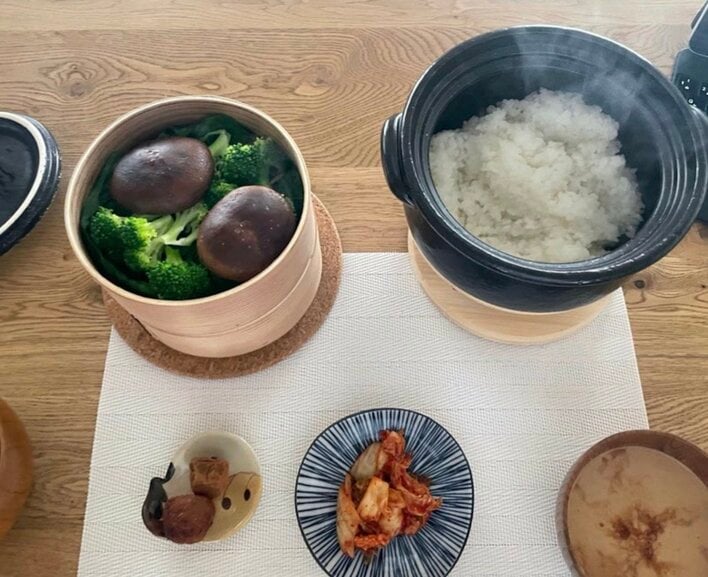 さらに「こっちも よろしくお願いします」と、この日投稿した写真には、土鍋で炊いたご飯と、せいろで蒸したブロッコリーと椎茸が。