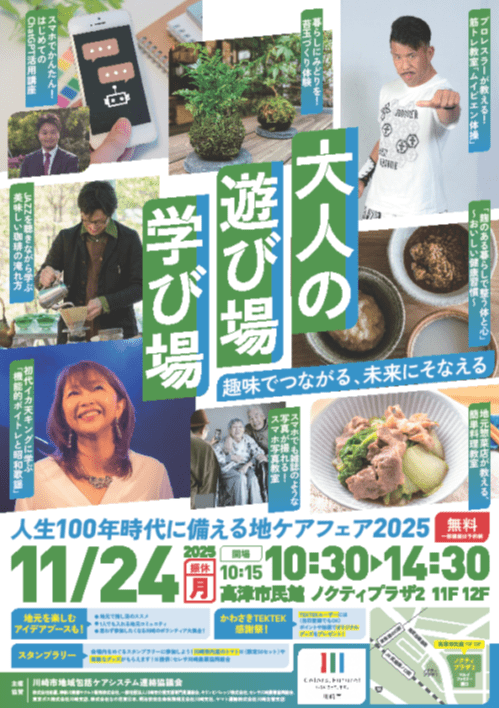 川崎市は、令和7年11月24日(月・振休)に、人生100年時代に備える地ケアフェア2025を開催いたします。3回目となる今年度は、「大人の 遊び場 学び場」と題し、新しい趣味への挑戦で新たな出会いやつながりのきっかけの一歩を踏み出せるよう、バラエティに富んだ講座・イベントを開催します。同時に、介護・認知症・終活情報を学ぶことのできる講座・展示等も開催します。