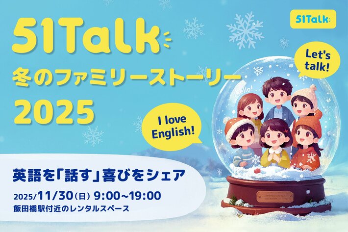 マンツーマンの子供向けオンライン英会話レッスンを提供する株式会社51Talk Japan(所在地:東京都港区、代表取締役:服部 慶)は、2025年11月30日(日)、東京都内にて「51Talk 冬のファミリーストーリー ― アンバサダー交流イベント」を開催します。本イベントには、当社アンバサダー会員家庭8組が参加し、家庭インタビューの映像撮影や親子での英語アクティビティ、学習体験の共有、屋外での撮影などを通じて、子どもたちが「英語を学ぶ」から「英語で話す」へと成長する姿を紹介します。51Talkは本イベントを通じて、英語教育を「暗記型」から「実践型」へとシフトする学びの在り方を提案し、「英語を学ぶことが、子どもの自信と世界を広げる力につながる」というブランドメッセージを発信します。