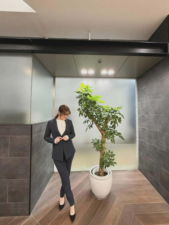 国家資格であるキャリアコンサルタント試験の実技を終えたことを報告し、スタイリッシュなスーツ姿を披露しました。