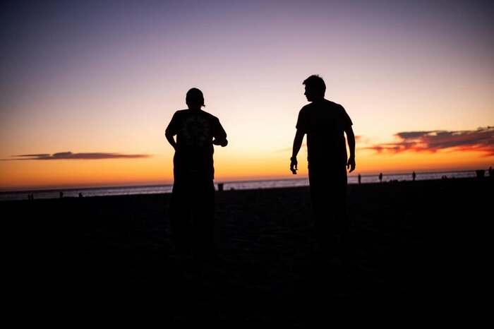 オレンジ色に染まる空に浮かび上がる2人のシルエットが、なんともロマンチックでアートのようです。