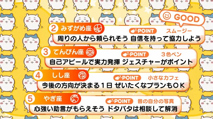 『めざましテレビ』で放送中の「ちいかわ占い」 テレビ放送がない日はお休みで、月~土:朝7時以降に更新予定です。