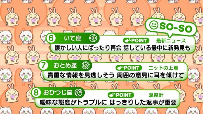 『めざましテレビ』で放送中の「ちいかわ占い」 テレビ放送がない日はお休みで、月~土:朝7時以降に更新予定です。