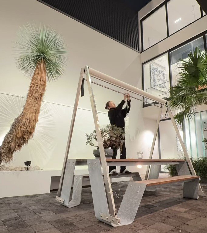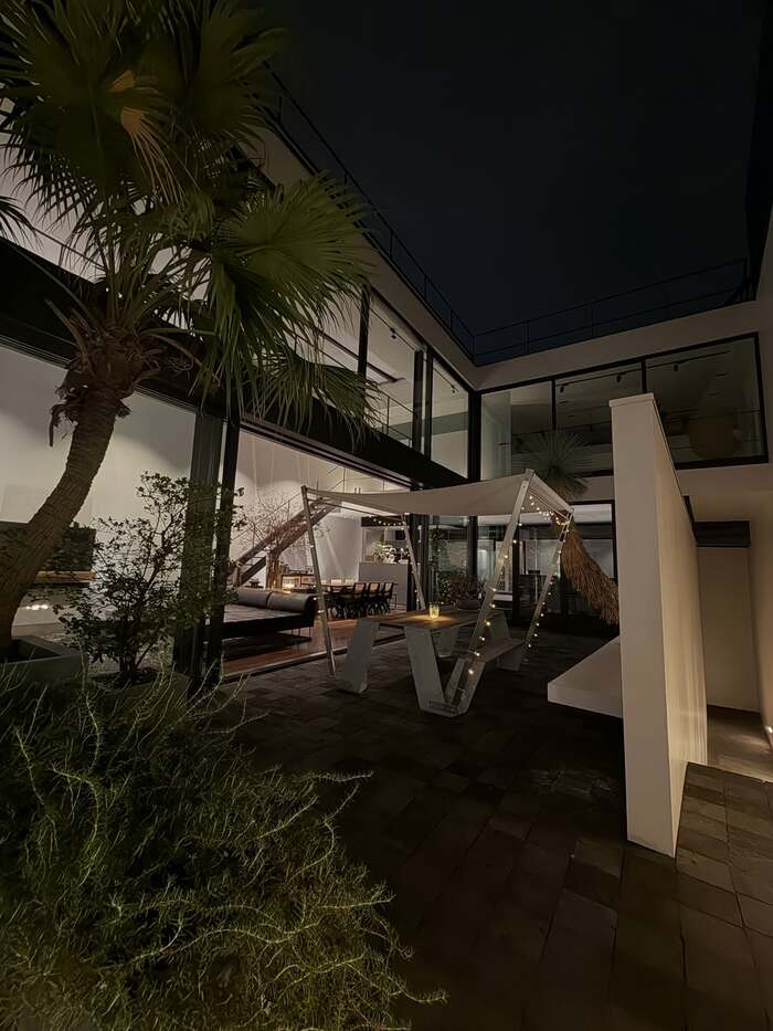 南国感ある木が植えられた広々としたお庭には、ガーデンテーブル&チェアが設置されています。
