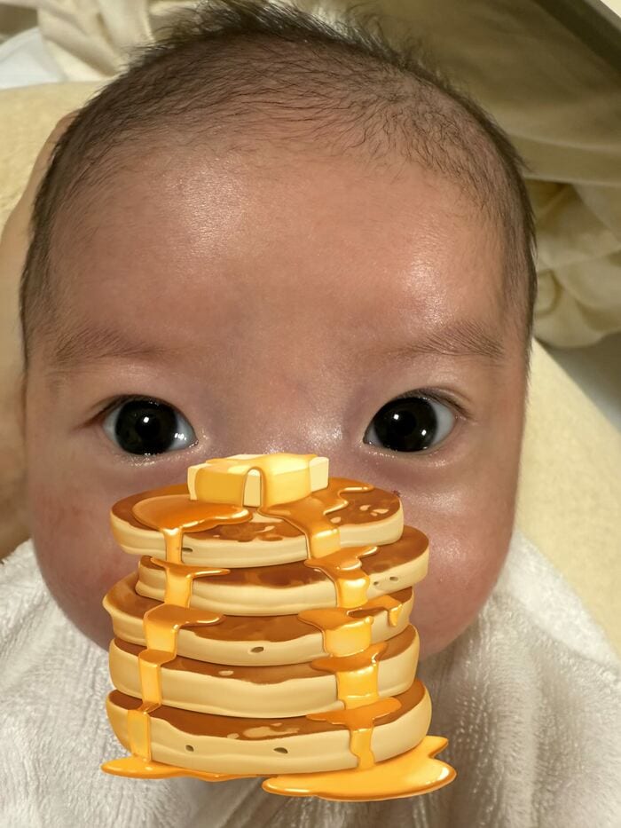 口元がパンケーキのイラストで隠されていますが、目元のインパクトが絶大です!