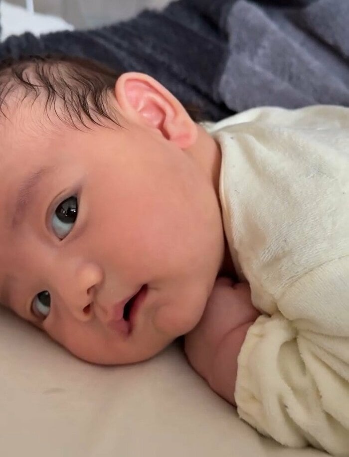 生後2ヵ月の息子とおそろいポーズをした親子ショットを公開しました。
