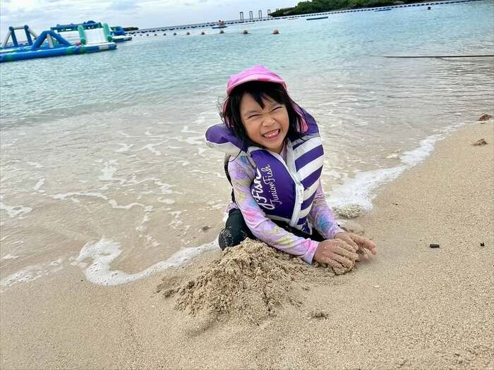 「沖縄の美味しい料理たくさん食べて たくさん海で遊びました 人生初のシュノーケルも体験 怖がることもなくずっとニコニコのえまちゃんでした」と、大満喫できた様子の瑛茉ちゃん。