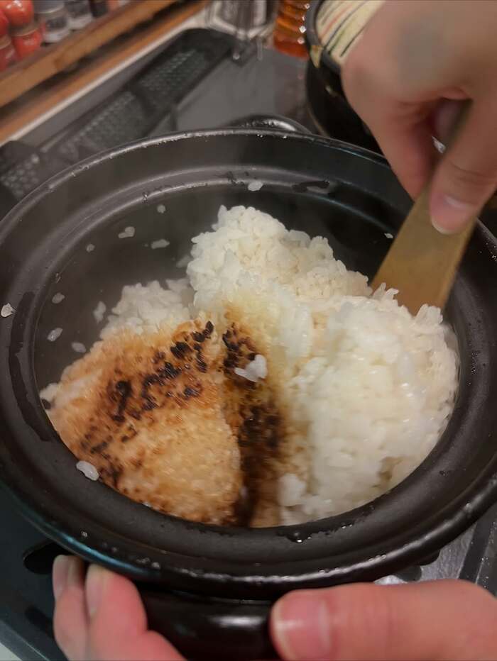 土鍋の中をのぞいてみると、湯気が立つツヤツヤの白米には、お焦げも。写真から香ばしい匂いも伝わってくるようで、とってもおいしそう!