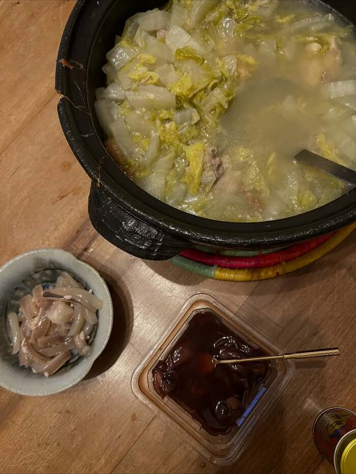 お鍋にはお肉とたっぷりの白菜が!芯まで柔らかそうで、トロトロに煮込まれている見た目がとってもおいしそう。体も温まりそうですね。