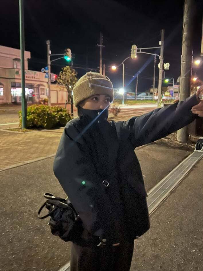 黒いダウンジャケットは上までしっかりファスナーを上げており、ニット帽をかぶって防寒対策はバッチリなようです。