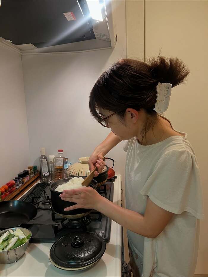 さらに「土鍋ごはんは目が楽しい」と、土鍋で炊いたご飯をかき混ぜている様子も公開。