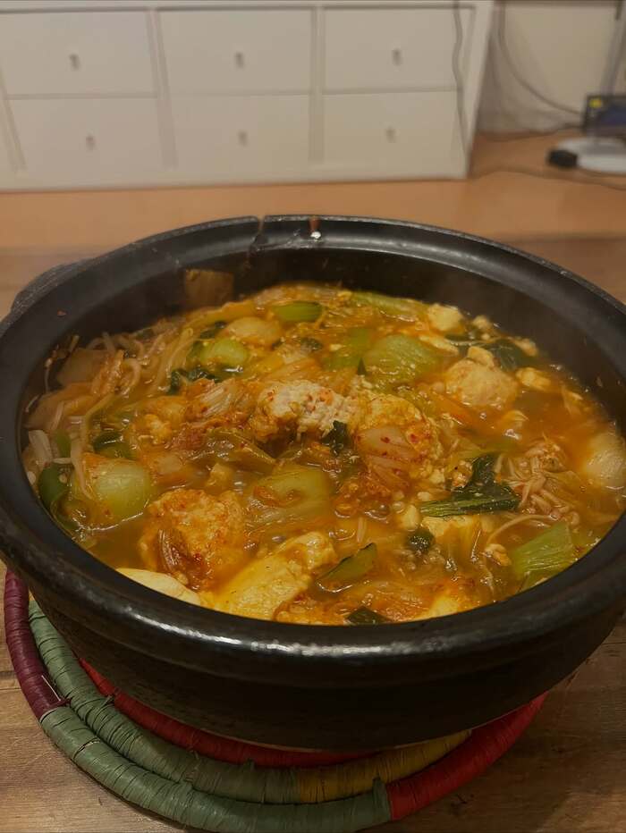 続いて「自分のご飯が食べたくて張り裂けそうな気持ちになる時があって、寝る時間を削ってでも何がなんでも食べたくなって妹とキムチ鍋」と、具材たっぷりの1品も。