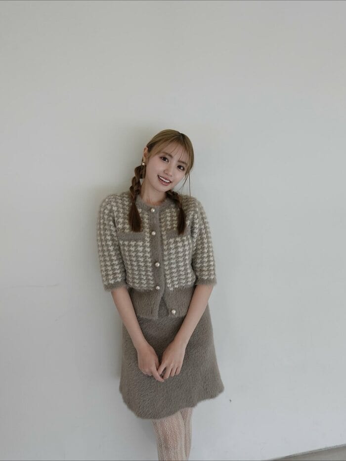 他にも、香音さんはグレーチェックのふわっとしたニットカーディガンにミニスカートを合わせたセットアップ姿も披露!
