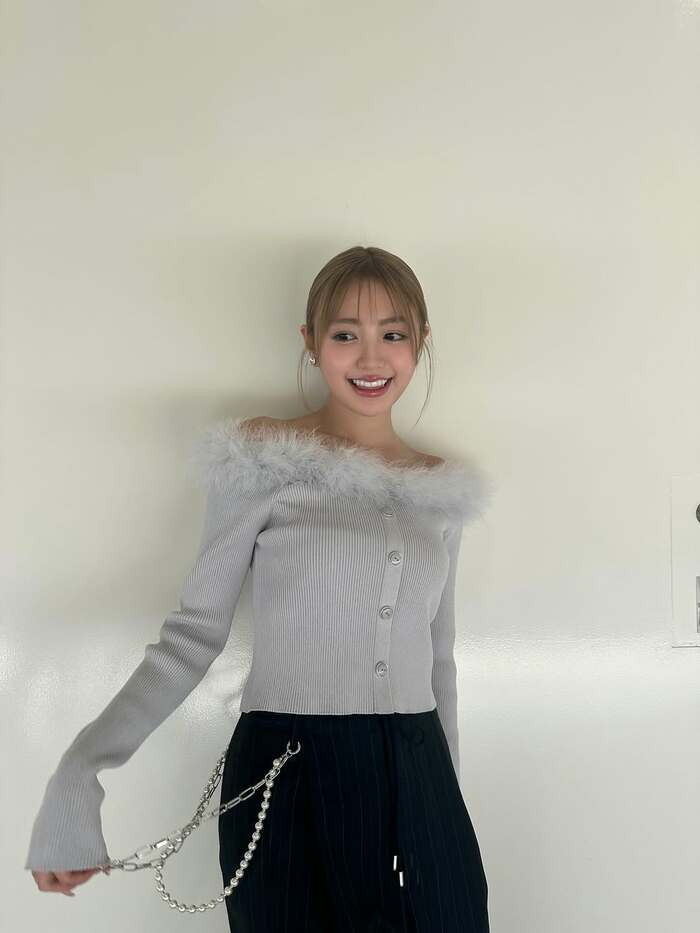 別の写真では胸元にファーがついたオフショルダーのグレーニットに、金髪姿でアップスタイルにしたスタイルも披露。