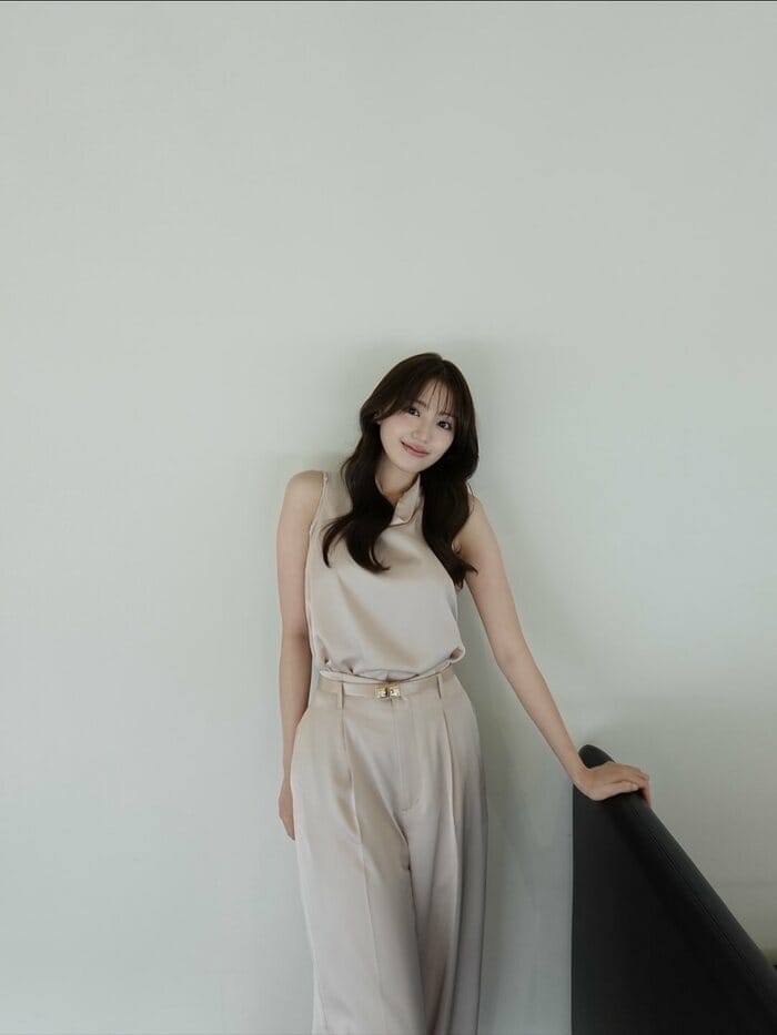 投稿では、髪の毛を明るくする前のブラウンのロングヘアで、ベージュのノースリーブとパンツをまとったコーディネートを披露!