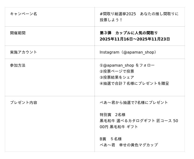 賃貸住宅仲介業店舗数No.1*のAPAMAN株式会社(東京都千代田区・EL CAMINO REAL株式会社の連結子会社代表取締役社長 山崎戒)は、公式Instagram(@apaman_shop)にて、フォロワー参加型キャンペーン「#間取り総選挙2025」の第3弾『家族に人気の間取り編』を、2025年11月16日(日)より開催いたします。投票・シェアを行ったフォロワーの中から抽選で 合計7名様に豪華賞品をプレゼント。目玉の特別賞には、黒毛和牛を堪能できる「選べるカタログギフト 匠コース(5,000円相当)」をご用意しています。