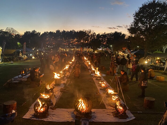 各メーカーの焚火台がずらりと並ぶ「試焚火」全景(日暮れ)