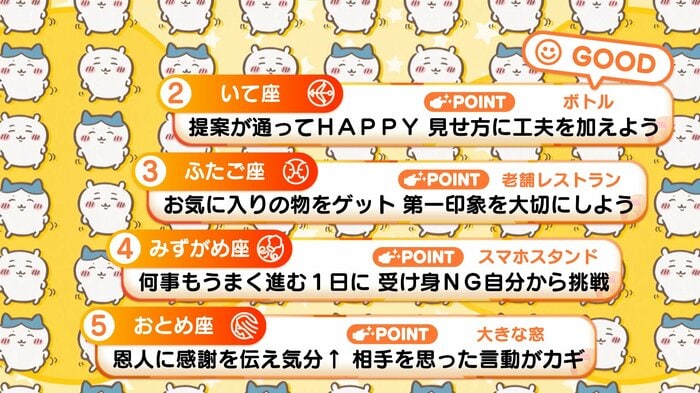 『めざましテレビ』で放送中の「ちいかわ占い」 テレビ放送がない日はお休みで、月~土:朝7時以降に更新予定です。