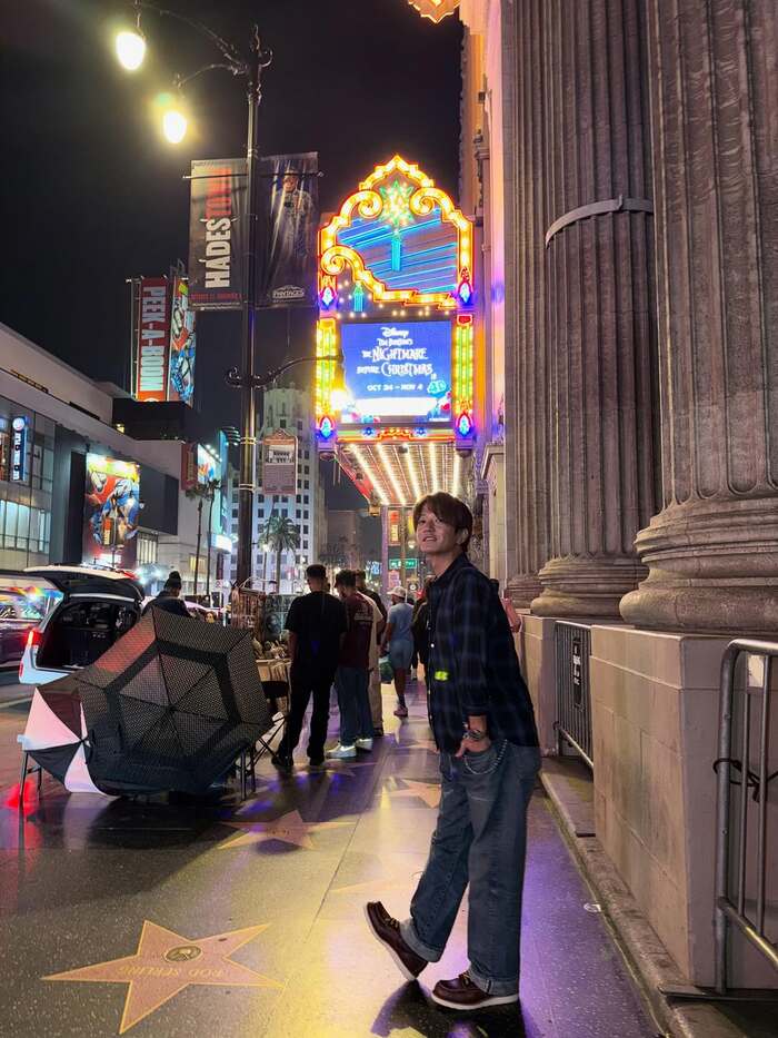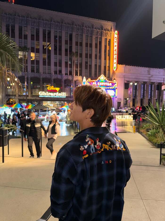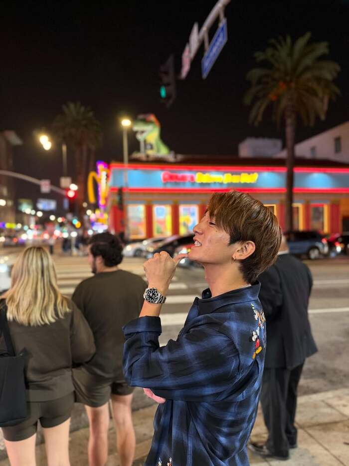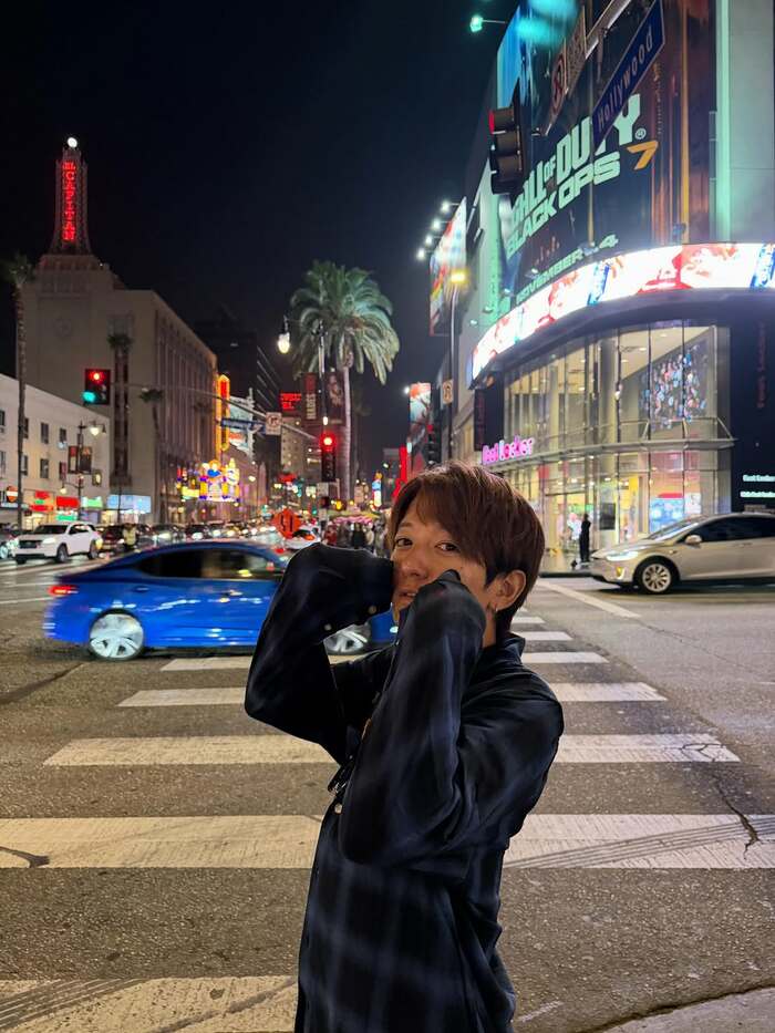 投稿した写真には夜のハリウッドの街を散策する大倉さんの姿。手すりに腰をかけ、体をひねらせながら遠くを見つめています。そんな大倉さんの後ろには、ギラギラと光る看板が見え、これぞ“ハリウッド”といった風景です。