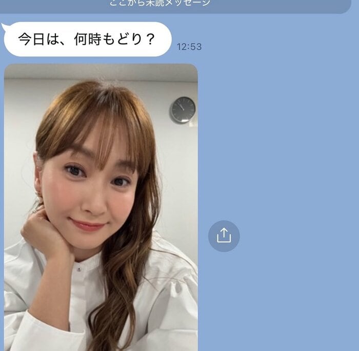 そのトークをスクショした画像を見てみると、ある日のLINEでは、藤本さんから「今日は、何時もどり?」と帰宅時間を確認するメッセージとともに、ニコッとほほ笑んだ藤本さんのキュートな自撮り写真が添えられているのが分かります!