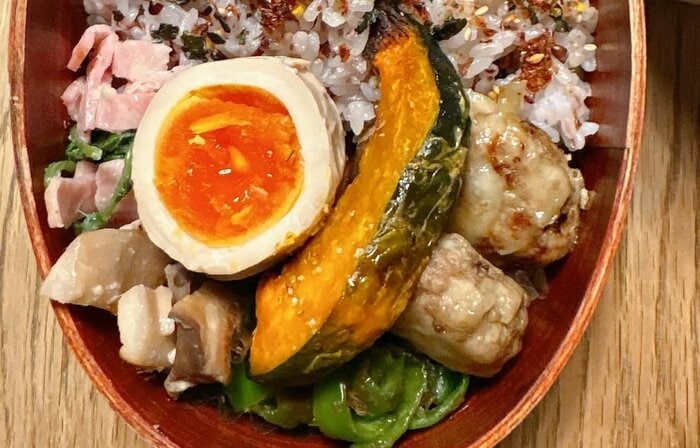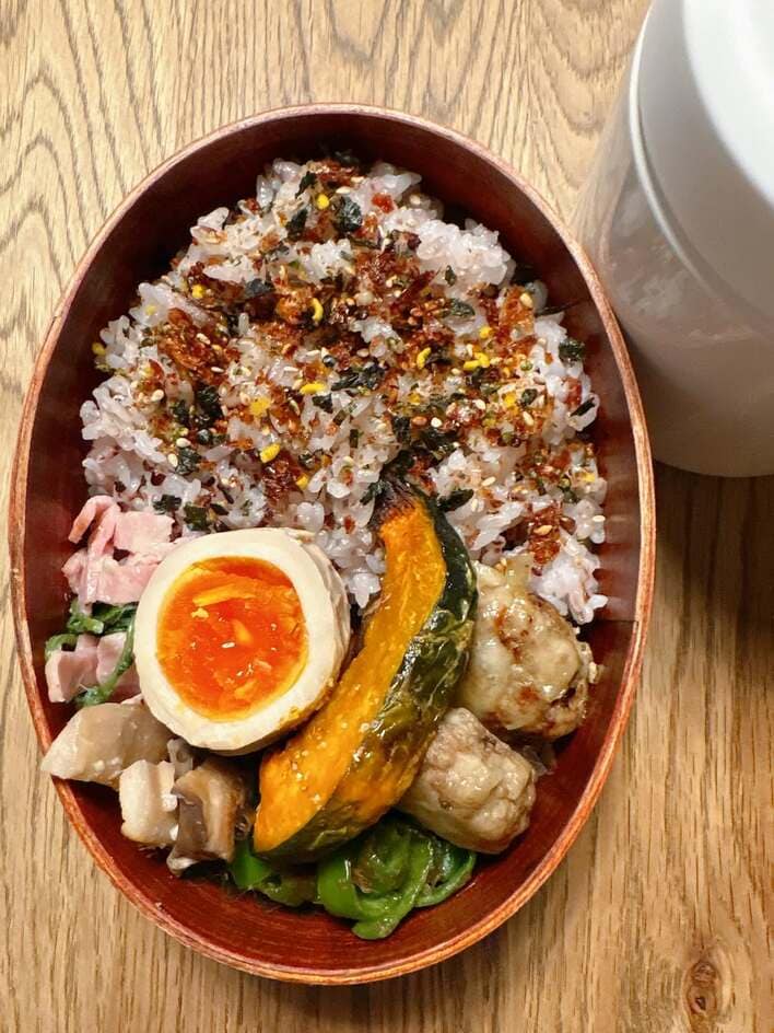 おかずを見てみると、ミニサイズのハンバーグが2つ。表面にはチーズがとろけていて、とってもおいしそう。他にも、かぼちゃや半分にカットされたゆで卵など、多種類のおかずが詰められています。