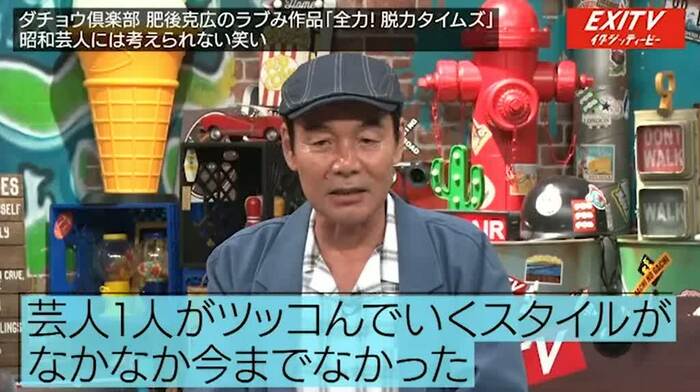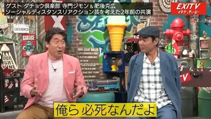 EXITが考えたソーシャルディスタンス芸を実際に採用していたことを兼近さんが喜ぶと、「代表作これといってなし、他力本願」(肥後さん)、「そうでないと時代に合わせて長くやってこられない」(ジモンさん)と、「結成37年」のダチョウ倶楽部のポリシー(?)を胸を張って語りました。
