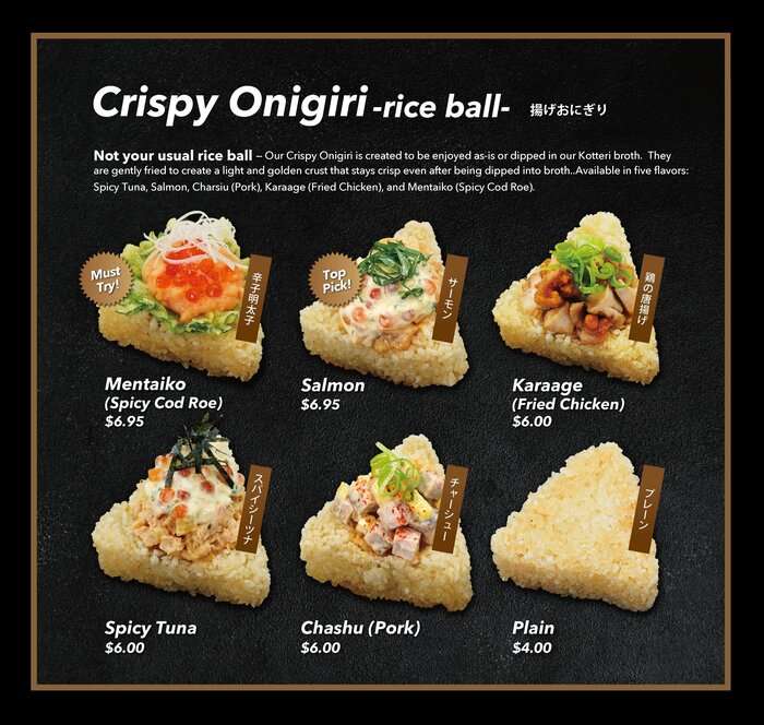 サイドメニューも見逃せません!大注目はLA本店限定の「Crispy Onigiri」。“飲むスープ”ではなく“食べるスープ”がコンセプト。濃厚な「KOTTERI」スープにディップして味わう、新感覚のおにぎりです。これは絶対に試してみたくなりますね!