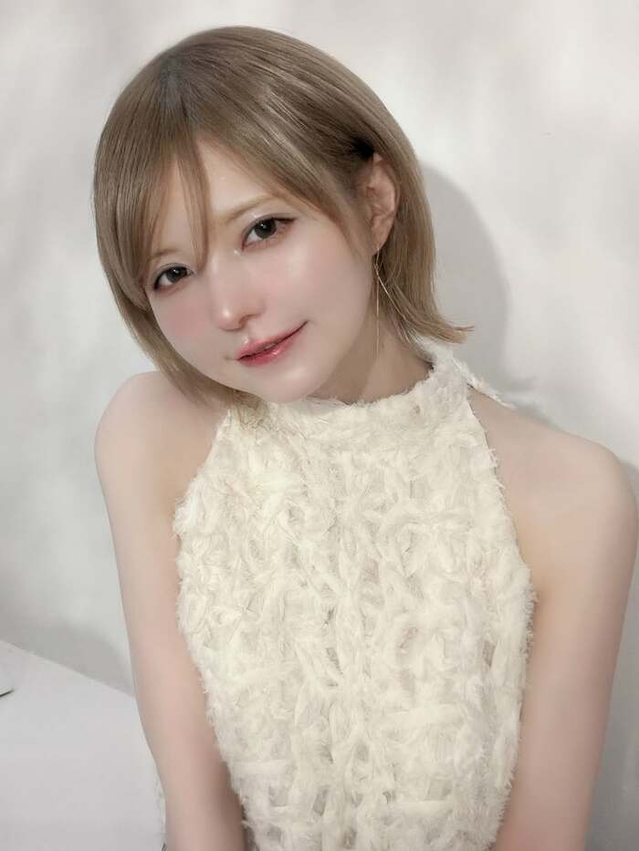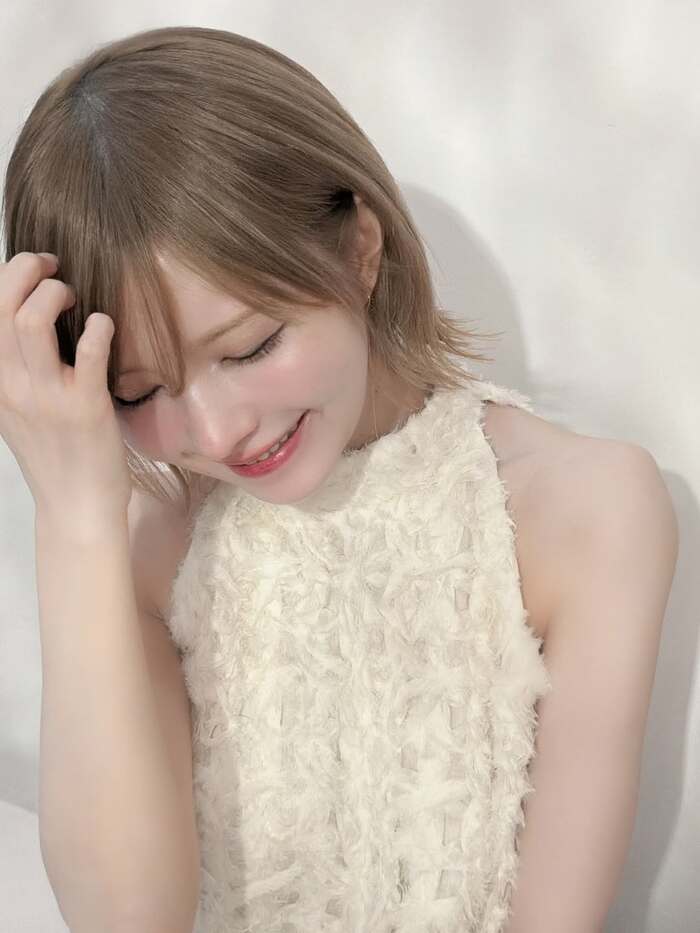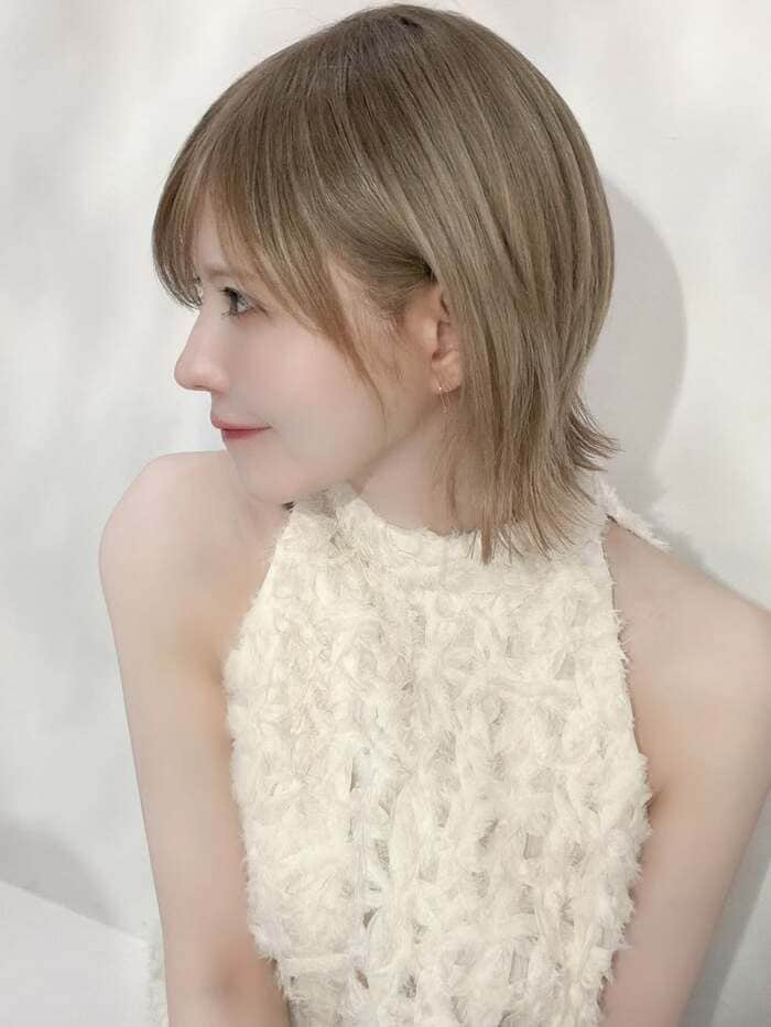 「女性っぽくもあり、メンズっぽさもある中性感を目指しました」というニューヘアスタイルは、前回 一番しっくりきたというミルクティーベージュ色のまま、襟足は外ハネで丸めのフォルムに。伸びかけをイメージしてもらったといいます。